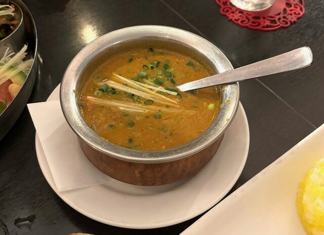 自由が丘駅から徒歩4分、ガラス扉を開け、階段を上がるとお店があります。天井が高く、席もゆったりと配置されているので優雅な感じがします。すぐさま日本語堪能なインド人スタッフの方が慣れた感じで席に案内して下さり、お手拭きをトングで渡してくれます。これは熱々に違いない、と熱さに驚かないよう心して受けとったら冷たくて驚きました。しっかりとしたタオル素材のためナンで油ぎってしまったお手手も問題なく清拭可能です。