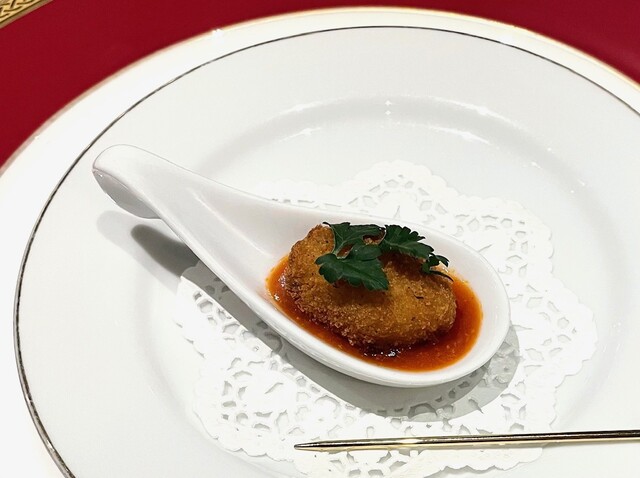 アミューズは一口サイズのフリットでした。サクサクと温かく、牡蠣のような貝の香り、トマトソースにほのかに香るパセリとガーリックがアクセントになって美味しかったです。
