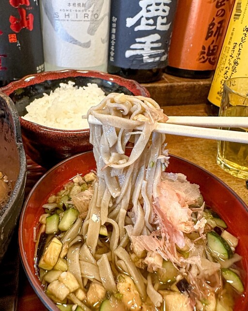 追加したミニ山形だし蕎麦はきゅうりとナスが細かく刻まれた冷たい出汁に、時々登場するミョウガのさっぱりした感じが素敵でした。