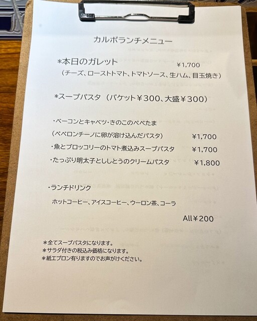 確かな情報ではないですが、メニュー写真1枚目のランチのスープパスタは平日限定で、土日は通常メニューな気がします。