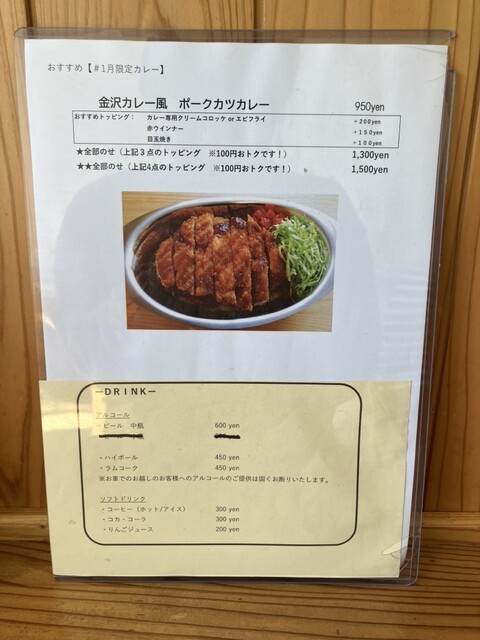 今月は金沢カレー風ポークカツカレーでした。3種類の全部のせを選んで、エビフライ、赤ウインナー、目玉焼きのトッピング!全部のせしたいので、ご飯少なめで-50円。