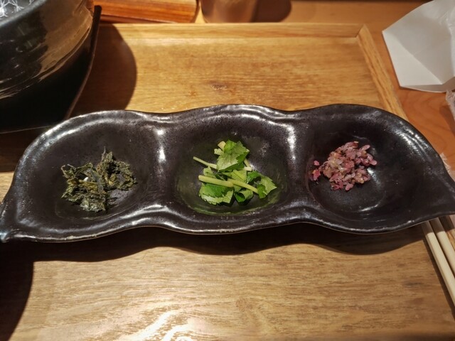 スープ割りには、わかめ、三つ葉、一口のゆかりご飯が付いてきました。
