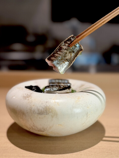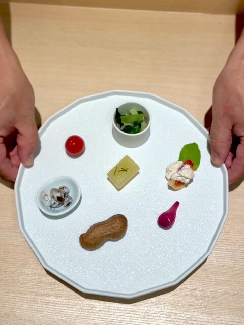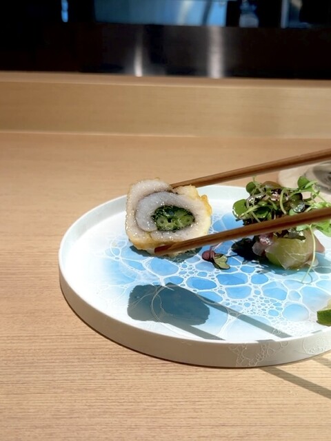 この日は9900円コースで全10品の構成。ハモの博多ネギ巻き揚げに始まり、シャインマスカットとチーズの生ハム包み、長崎本マグロ中トロの海苔醤油、新サンマ炙り 青唐辛子と茗荷の醤油漬けなど、