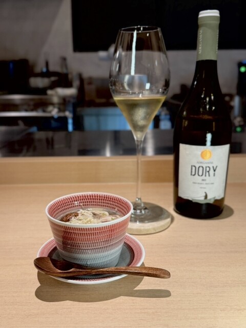 特に印象的だったのは、長崎キンメダイのウロコ焼き。キンメの出汁を使ったルールブランソースとブロッコリーのピュレが絶妙で、パリッと焼かれたウロコの香ばしさが旨味を引き立てていました。和の繊細さとフレンチの奥行きが見事に溶け合った一皿です。