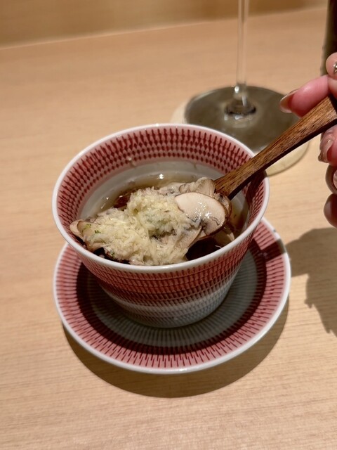 茶碗蒸しは、4種のキノコとアサリのスープ仕立て。マッシュルームと生栗をすりおろして加えることで、ほのかな甘みと香りが広がる秋らしい温かさのある味わいに。