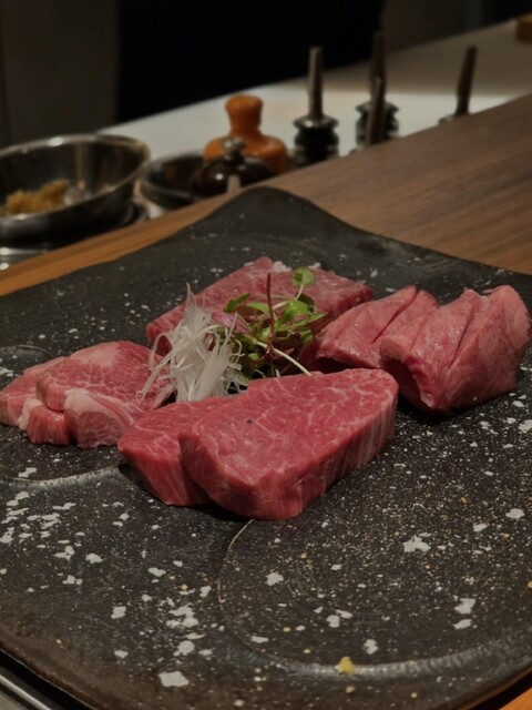 前菜から始まり、和牛のお刺身はしっとりと舌に吸いつくような口どけ。塩焼肉盛りでは、特に和牛タンの歯切れの良さと旨みが印象的でした。