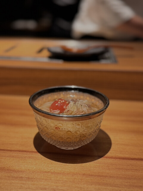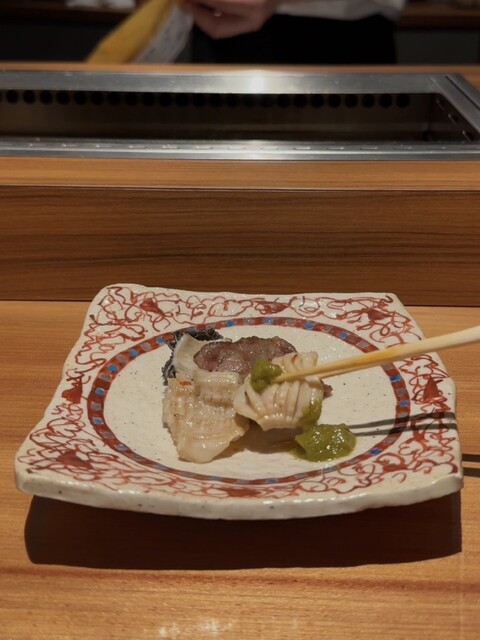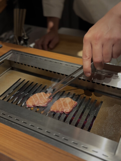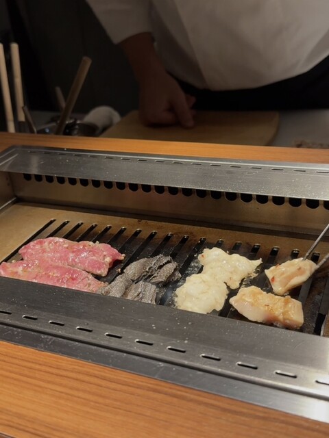店内は広めに設計された10席のカウンターが中心で、目の前でスタッフの方が丁寧にアテンドしてくださる“オールアテンド式”。照明も優しく、静かに焼ける音や香りまで楽しめる、とても贅沢な空間です。