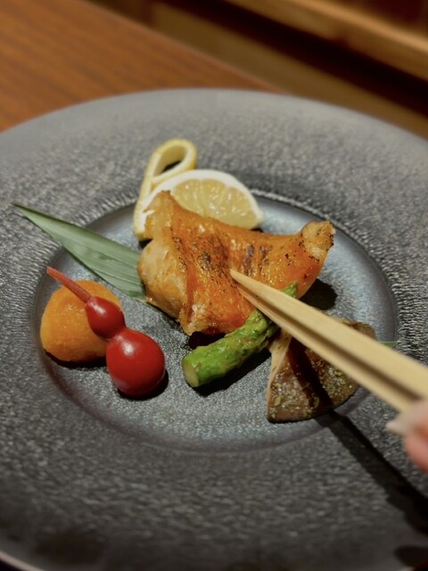 焼物はパリッ&ふっくらと仕上がった キンキ塩焼きが絶品で、染卸しや檸檬で味の変化も楽しめます。香ばしい ジャンボ椎茸バターの香りにもうっとり。