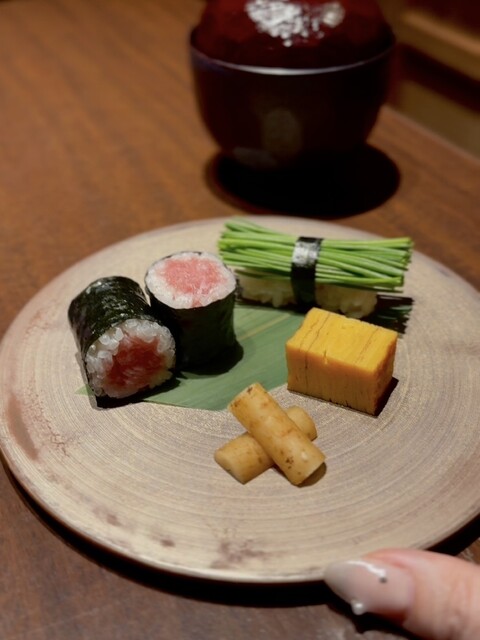 お寿司は二段構成で、まずは ヤリイカ・勘八・鮪赤身・イクラ の4貫。計算された握りと素材の良さが際立ちます。続いてトロ鉄火巻き・芽葱玉子・叩き牛蒡 が登場し、最後までコースの流れが美しく続きました。