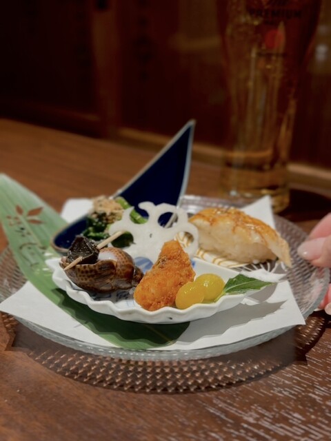 今回いただいたのは お任せコース(8,500円)。先付けは上品でまろやかな 雲子玉地蒸し から始まり、法護草のお浸し・梅貝旨煮・穴子笹巻寿司・銀杏・蛸唐揚げ の前菜が彩りよく並びます。どれも小さな一皿に季節の香りがギュッと詰まっていました。