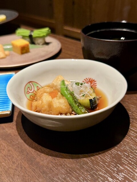 途中に出てきた 豆腐の共地餡(木の芽・茄子・青梗菜) も、ほっと落ちつく優しい味わいです。
