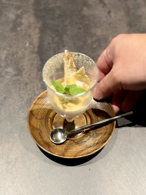 茗荷のアラ出汁味噌汁でほっと一息ついたあとは、デザートの焼き芋のブランマンジェ。素朴でやさしく、食後にちょうど良い甘さです。