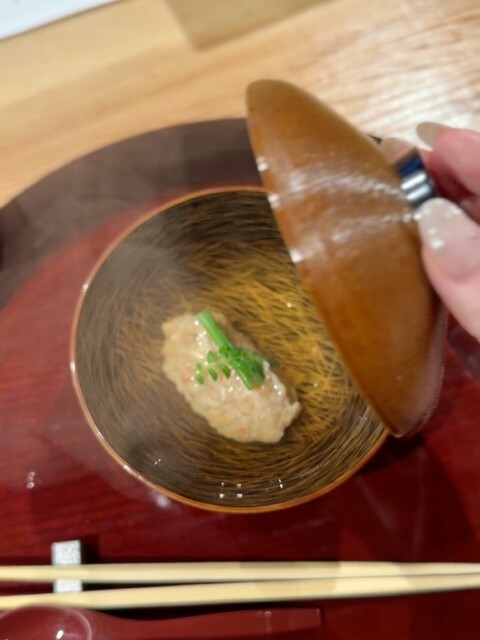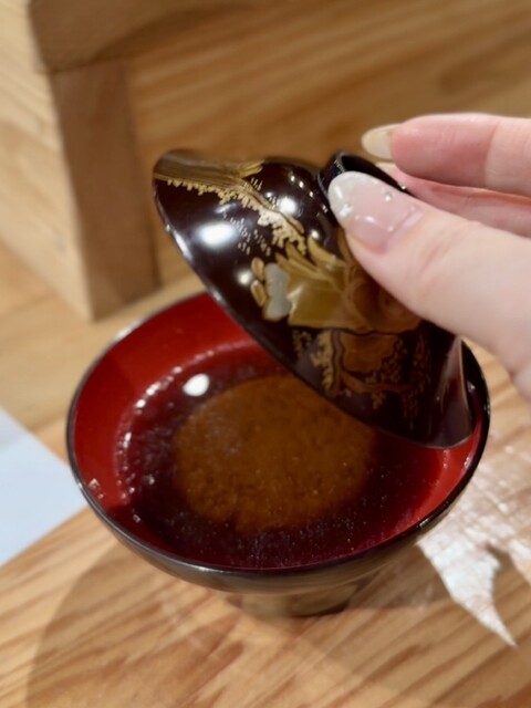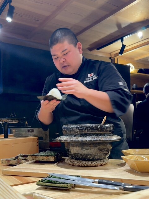 そして、このコース最大の目玉は、やはりおにぎり。出来たてのご飯を熱いながらも、目の前で一つひとつ丁寧に握ってくださる姿は、思わず見入ってしまうほど。ふんわりと空気を含んだおにぎりは、口に入れた瞬間ほろりとほどけ、お米の甘みがじんわりと広がります。