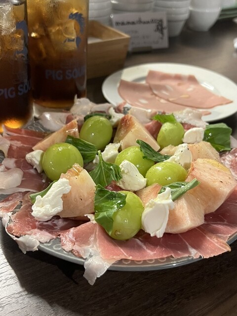 もうシャインも桃も甘くて生ハムとの