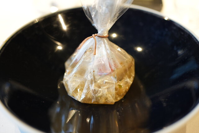 最初に頂いたのは古代醤が乗ったフィナンシェやスムージー、綿飴をまとったサーモン。
