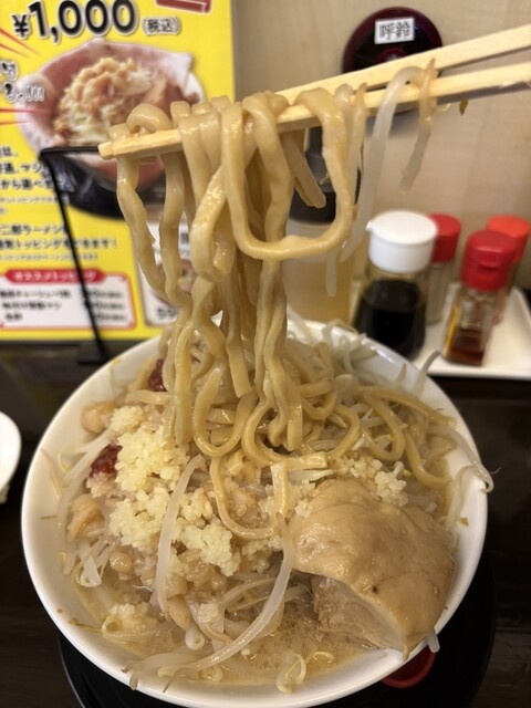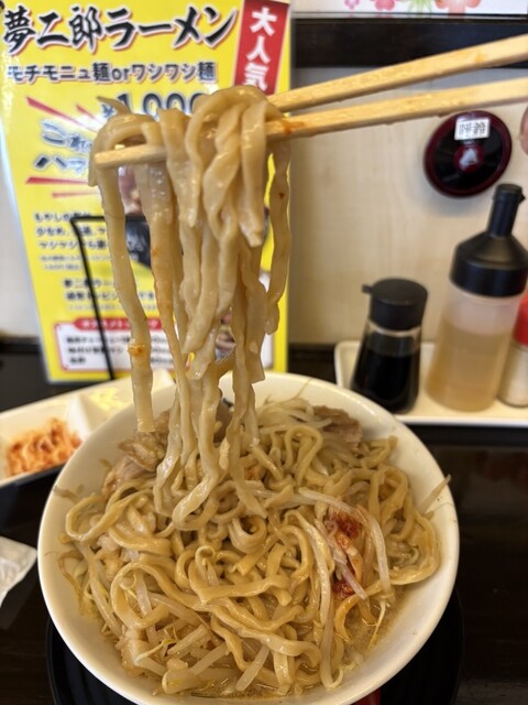 夢二郎ラーメン モヤシ増し増し(60円)、チャーシュー1つトッピング(220円)、背脂増し(100円)、ニンニク増し(無料) 合計1,380円