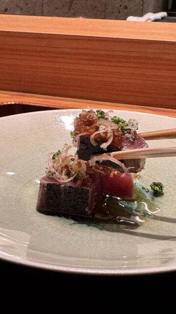 先付は車海老に“おおまさり”のピーナッツソースを合わせたいちじく添え。甘みと香ばしさ、海老の旨みが重なるバランスがとても面白く、最初の一皿から心を掴まれました。藁焼きのかつおは香りが立ち、松茸は香りも食感も素晴らしく、季節感がしっかりと伝わります。