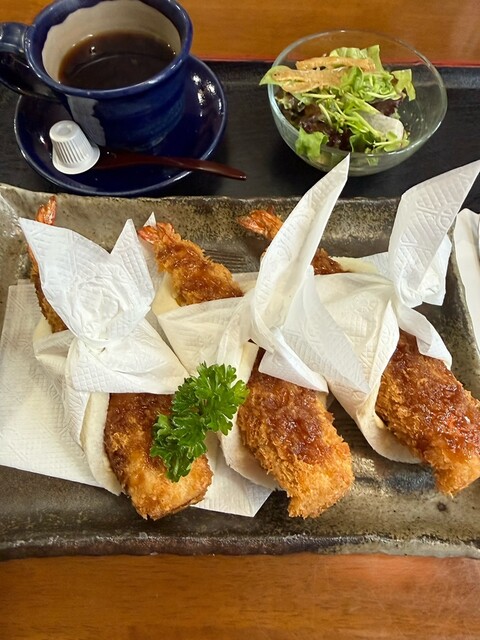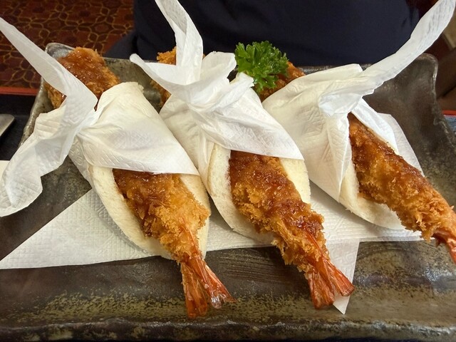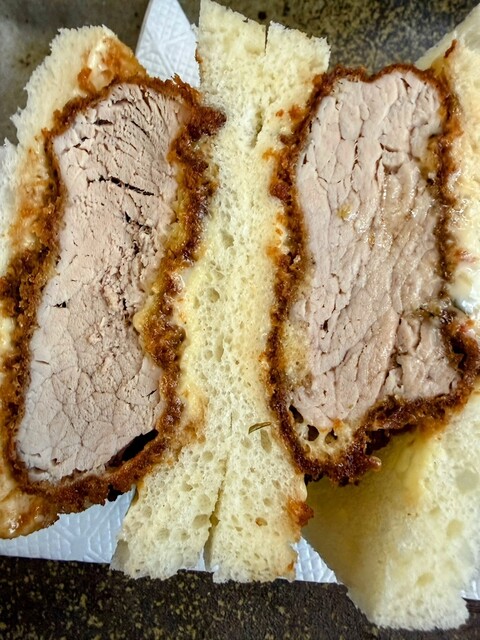 すごいサンドイッチがまもなく到着。カツもエビフライも熱々の出来たてで暖まるし大変美味しくいただきました。ヒレカツは柔らかく厚さ2〜3cmあろうかという大きさ、エビフライも衣フライではありません。お味もよろしくお腹いっぱいでコスパもよろしい。