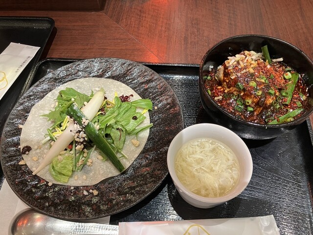 麻婆豆腐はビックリするぐらいの大きなコロッとした豆腐がドーンとご飯の真ん中に乗っており崩しながら食べました。白いままの豆腐も美味しいです。