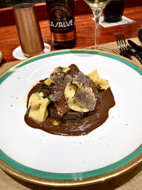 今回特に凄かったのが帆立のムースをズッキーニをタリアテッレに見立てた大きさにカットしたもので巻きたっぷりのブールブランソースにフレッシュのホタテを浮かべてトップには大量のトリュフを掛けた料理が最高でした!