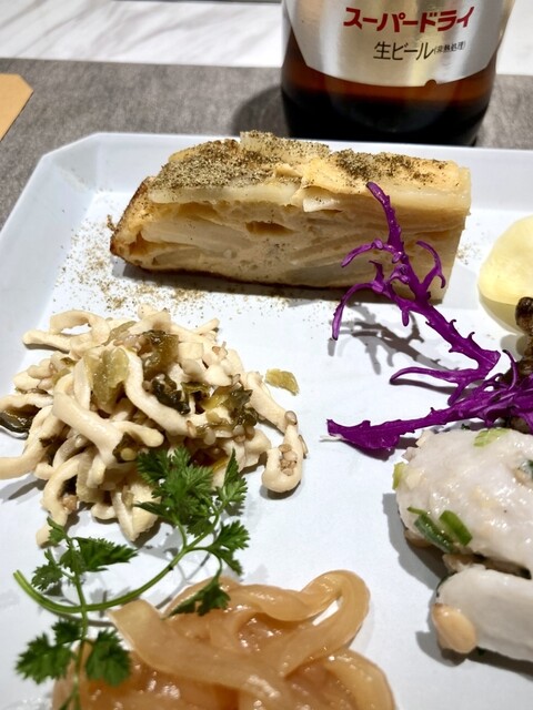 スタートの中華前菜盛り合わせから驚きです。レバーパテやスパニッシュオムレツの中華バージョンが入ってます。ほんのり中華風ですが完全に洋食!平賀シェフの料理の幅の広さが伺えます。次に点心の菜の花と海鮮の焼売2種。タレを付けなくても美味しく食材がハッキリ分かる素晴らしい逸品。