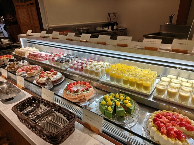ショーケースにキレイなケーキやゼリーが並んでます。