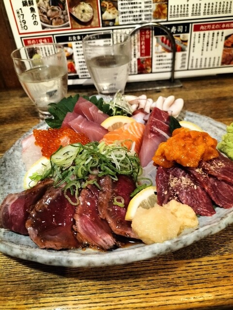 新鮮な魚介・牛豚馬の肉料理を楽しめ、全国の日本酒を味わえます