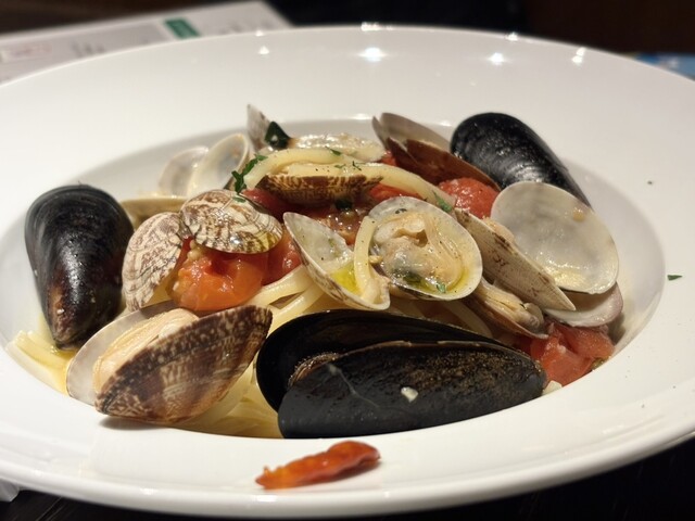 スタッフの方がとても丁寧に案内してくださり、飲み放題とアラカルトで注文。新鮮で食べ応えのあるサラダ、香り豊かなアヒージョ、ぷりっとしたムール貝のパスタ、そして締めにいただいた焼きたてのマルゲリータまで、
