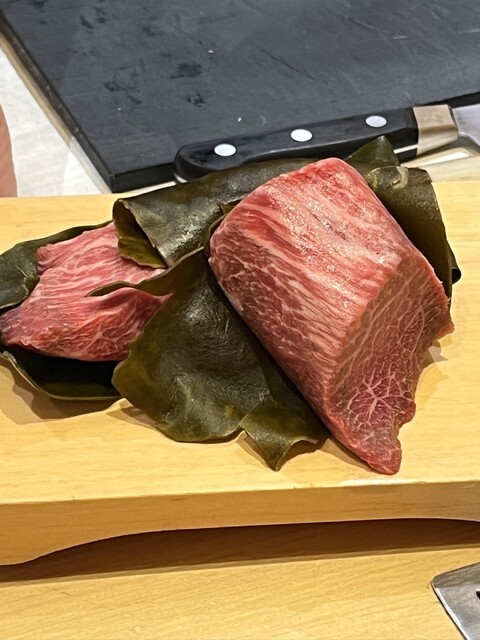 「昆布締めの寿司」は昆布の深い味わいが肉に染み出し、かみしめるほどに赤身の豊かな風味がじわっと押し寄せます♪