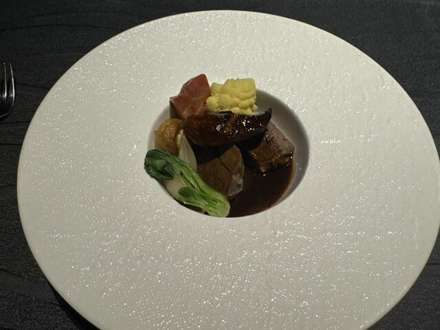 メインディッシュは選択可能であったので、プラス1,500円で「蝦夷鹿肉と赤ワイン煮込みと黄金色のフォアグラ」を頼んだ。
