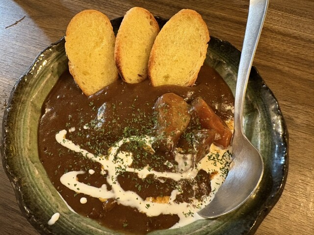 一緒に提供されるガーリックトーストに煮込みのソースをたっぷりつけて頬張れば、満足感も倍増。