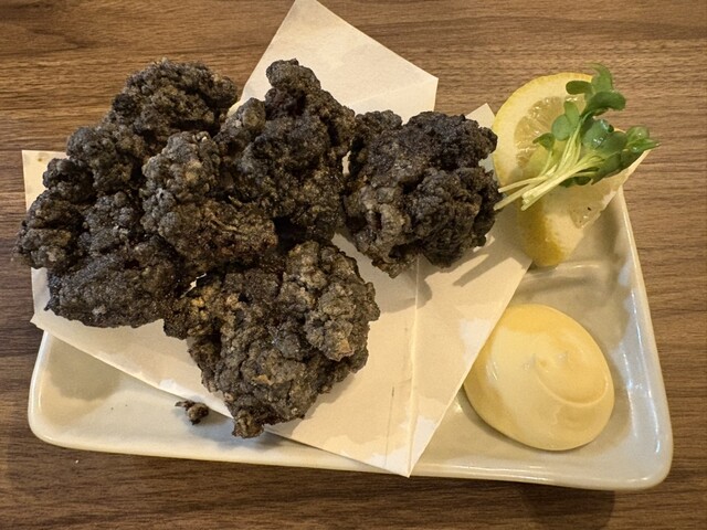 衣には黒いソースか炭を使っているのか、ガツンと効いたにんにくの香りとスパイシーさがクセになる、インパクト抜群の唐揚げです。
