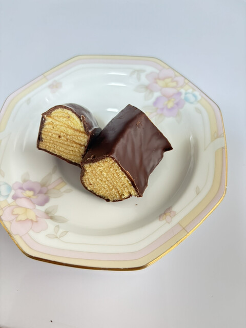 カカオの、コロニさと甘さのハーモニー。バームクーヘンの周りにカカオが塗ってある。とてもおいしいチョコは溶けると白濁すると思いますが、すぐにいただく時はたまに温めたりすることもあります。