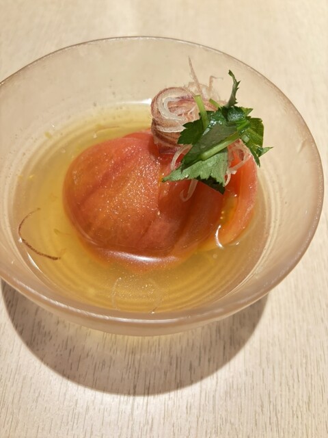 そして、お刺身と茶碗蒸し、それになんとデザートまでついたオボン、、、一風変わったトマトのサラダ(こちらはまるまる一つ)を、トマトをなんとスープ漬けのようにしてあって、冷たく提供