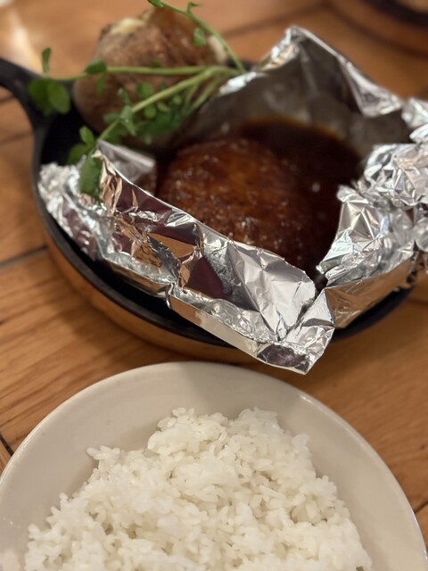 ハンブルグステーキは、ホイルを破くと食欲をそそる湯気がもぁ〜っと、中はじゅうじゅうしていて、久々のつばめグリルなのでテンション爆上がり