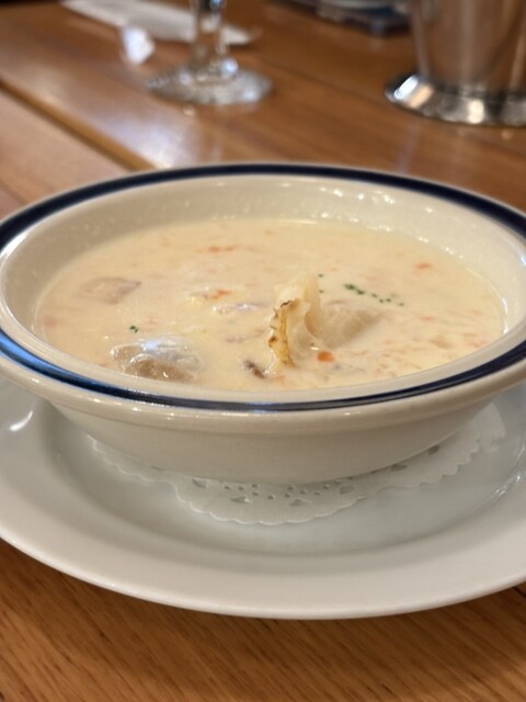 最初にスープがサーブ。帆立のチャウダーは帆立がゴロゴロ入っていて、海老も嬉しい。玉ねぎの食感も絶妙。お店のスープだなぁとしみじみ幸せを感じながら頂く。