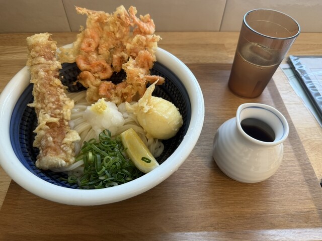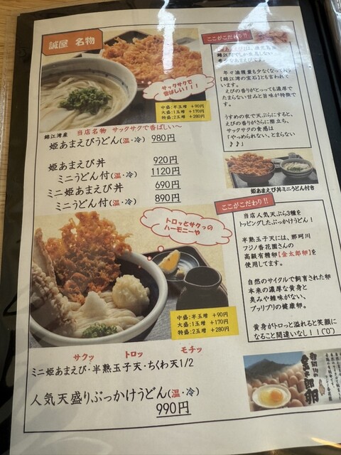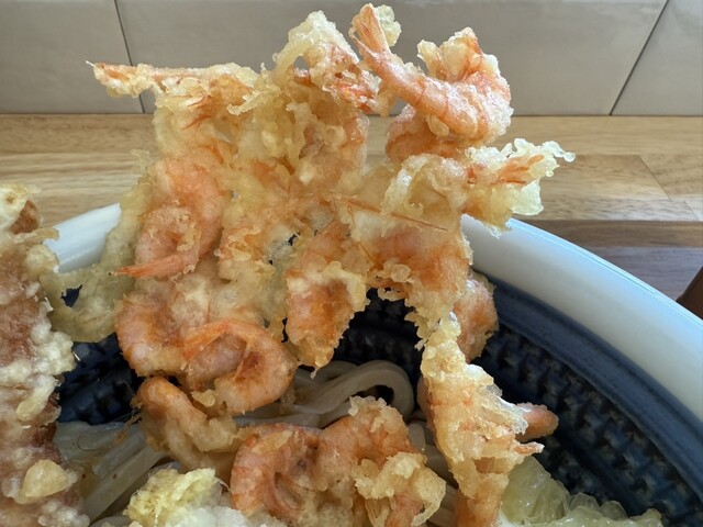名物のサクラエビフライがのった、温玉うどんを注文。