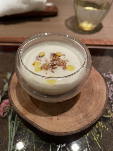 玉ねぎのポタージュ 自家製の鹿の肉入った七味