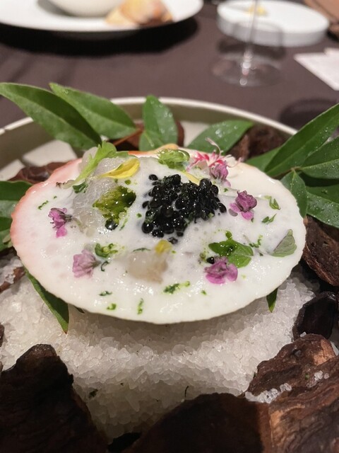 鳥貝 鳥貝エキスのソース 甘エビと根セロリのピューレ キャビア