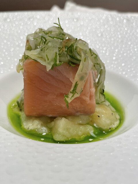 サーモンのミキュイxきたあかりx茴香サラダ ピストゥソース