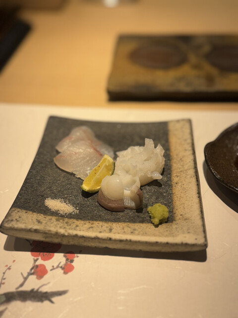 ・刺身盛り合わせ(青森のヒラメ、北海道のみずたこ、ゆずと藻塩を添えて)