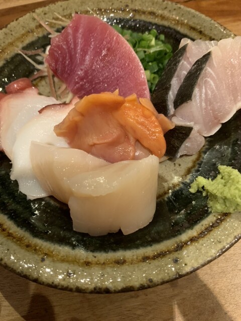 刺身盛りを注文すると、マグロ、たこ、ホタテ、ボタンエビと刺身はどれももっちりウマウマ。室内暖かく忘れてた目的であるおでんも追加。せんだいふ、つくねをいただきました。オススメ日本酒も出していただき、〆に日本酒だしわり!初めてで??でしたが、次回も挑戦したいかな。