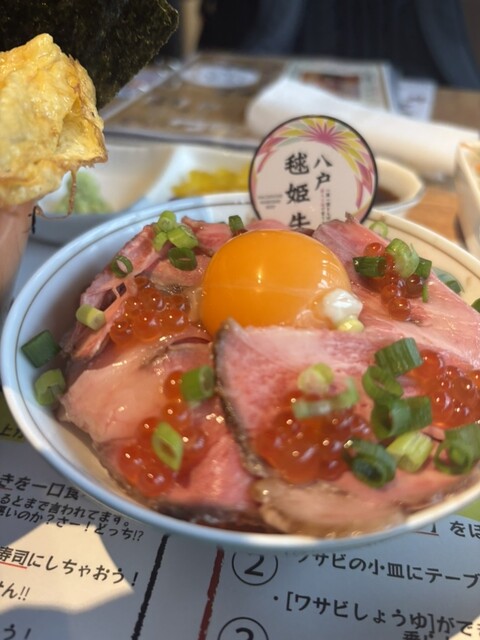 たまご丼は特製たまご焼き、すじこ、たらこ、いくら、海苔が乗ったどんぶり。たまご焼きうま。魚卵と海苔も良い仕事。八戸毬姫牛のローストビーフは脂のってやわらか。まぶしたイクラの塩味とも合いウマウマ。ローストビーフダレや、ワサビといただし醤油で味変。サラダ、味噌汁、漬物付き。