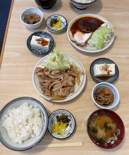 おすすめはハンバーグ肉汁が豊富で、デミグラスソースがまろやかで美味しい。お米は水分少なめで粒だった感じで、味噌汁は具材豊富。