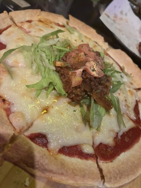 バッファローチキンはスパイスが効いていて、お酒のつまみにぴったりでした。やみつきポテトは熱々でサクサク食感がよく、沖縄定番のタコスピザはチーズたっぷりでピリ辛、間違いない美味しさ!