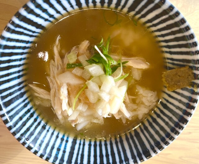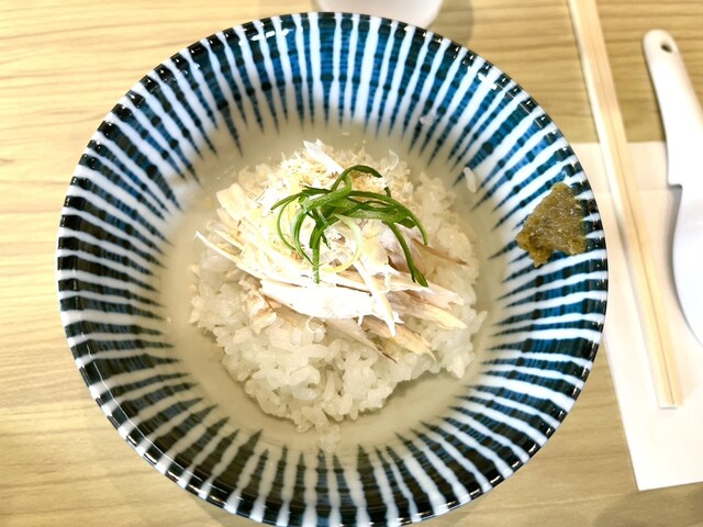 ご飯に煮干しの効いた出汁と柚子の香り、ピリッと来る辛さのアンサンブルがたまらぬ。そこに縦に裂いた鶏ササミの歯応えがアクセントを加えてくれ、息つく暇もなく飲み干してしまう。