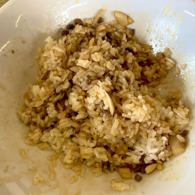 この〆飯をそのまま食するのは論外、絶対に塩ラーメンと組み合わせ、スープをヒタヒタに加え添えられた柚子胡椒を溶いて箸をもってかき込む。