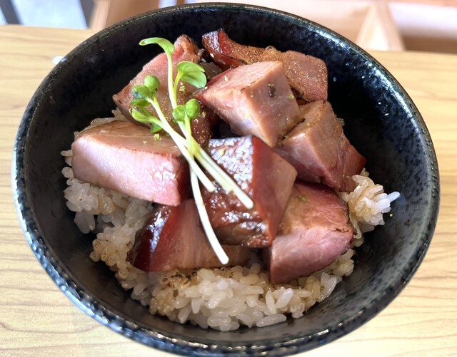同時に注文した豚丼では燻製チャーシューの存在感と主張が非常に面白い。