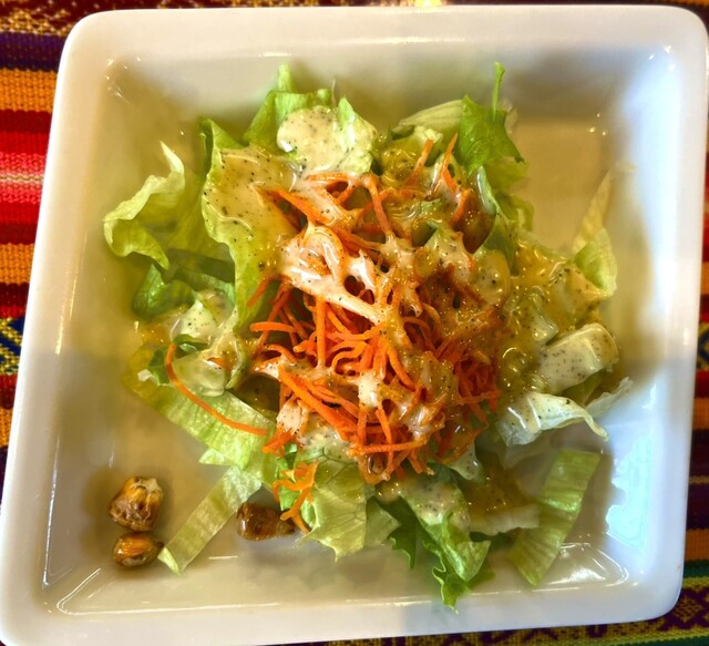 サラダの酸っぱいドレッシングは日本人にも合い、カリッと焼かれたトウモロコシがアクセントになっている。