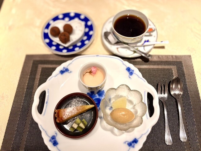 メープルのアイスクリーム、洋梨のタルト•キーウィ、桜のブラン•マンジェ、トリュフチョコレート、コーヒー